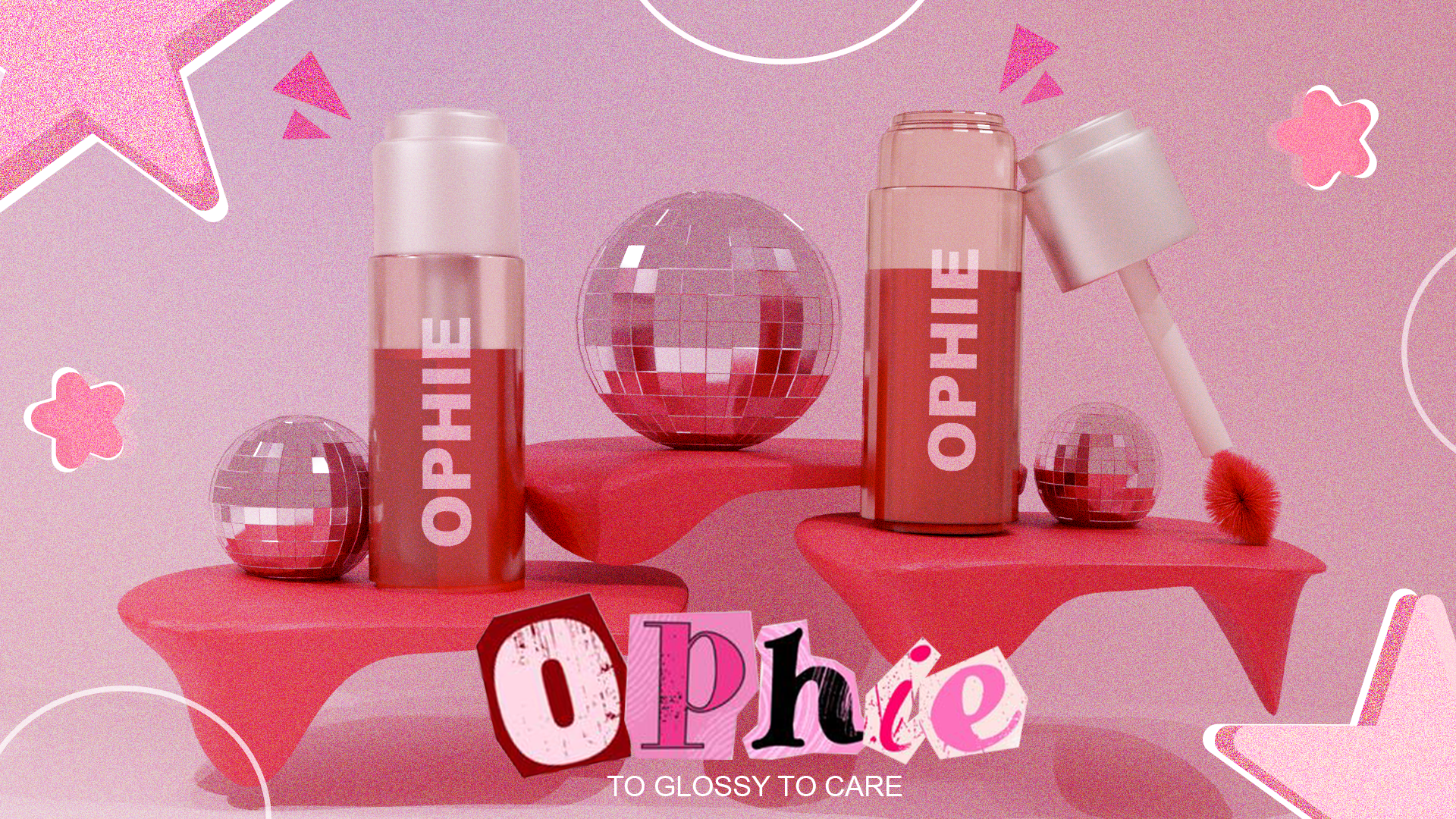Ophie is a playful lip gloss brand inspired by early 2000s glamour, soft-girl aesthetics, and Bratz-style attitude. The brand celebrates confidence, self-expression, and the joy of being glossy. Ophie’s visual identity blends pastel color palettes, sparkly textures, and bold, pouty typography to create a fun and nostalgic Y2K atmosphere.